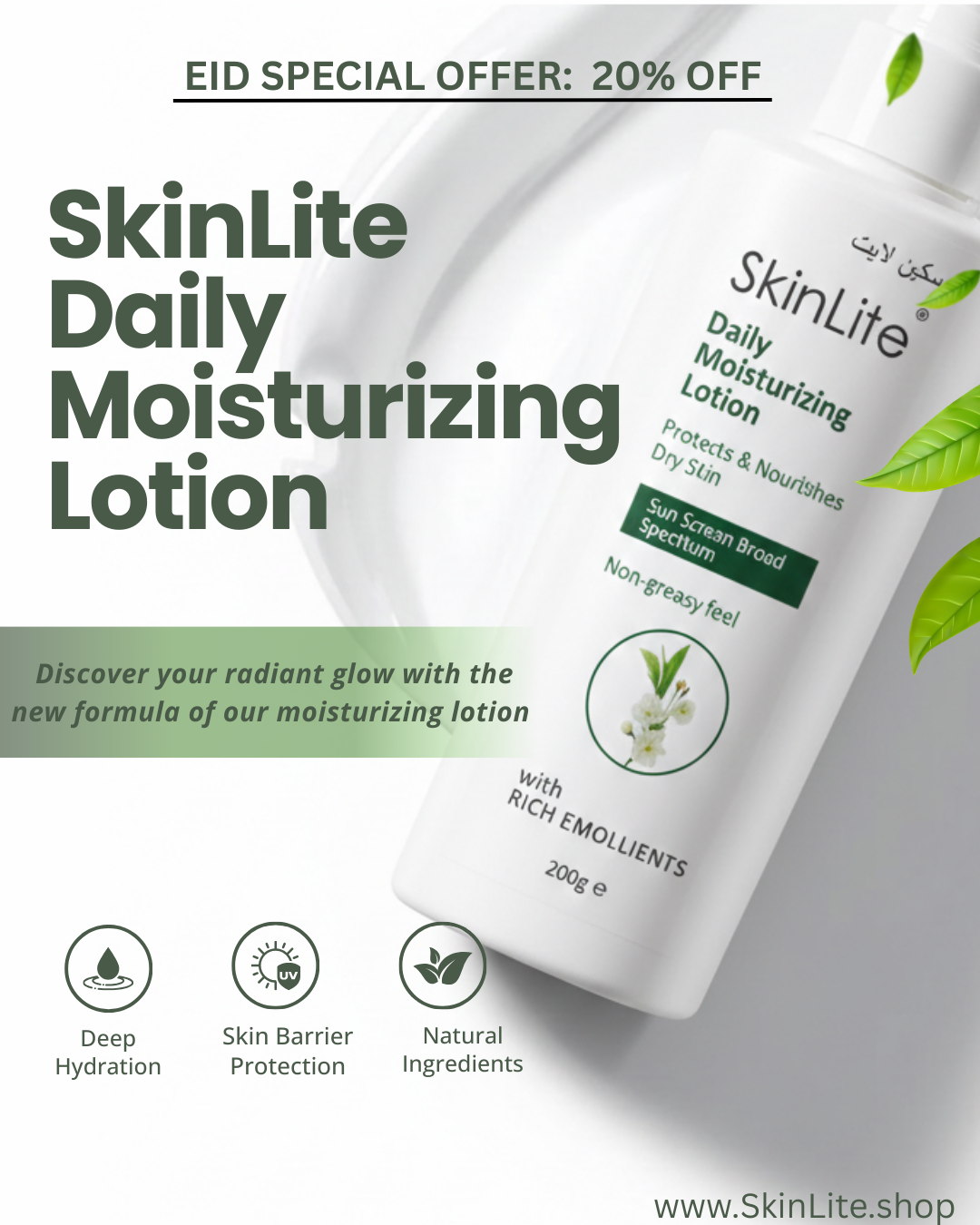 SkinLite Daily Moisturising Lotion is specially designed to keep your skin soft, smooth, and deeply hydrated throughout the day. Its lightweight formula absorbs instantly, leaving a fresh, non-greasy glow while nourishing your skin from within. Perfect for daily use, it restores natural moisture and gives your skin a healthy, radiant look you can feel confident about.